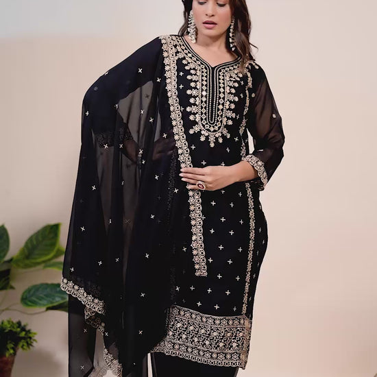 Celebrate the festive season in style with this elegant designer heavy embroidery suit set, crafted with premium faux georgette fabric and detailed sequence work. A perfect blend of luxury, comfort, and festive charm.