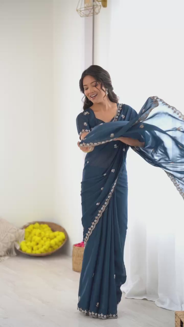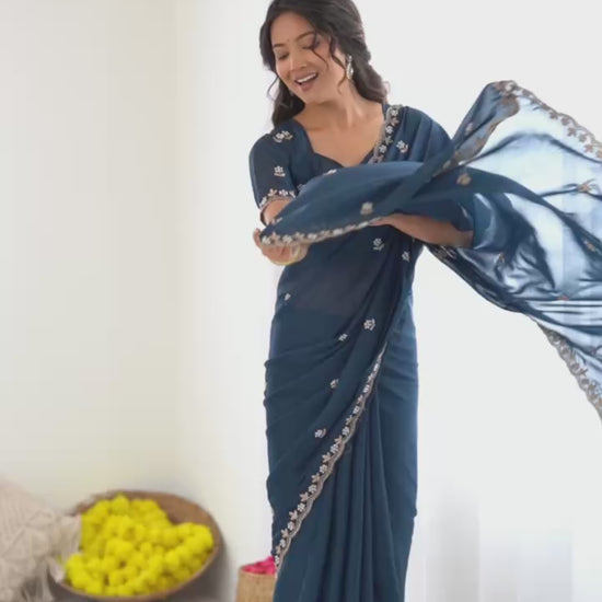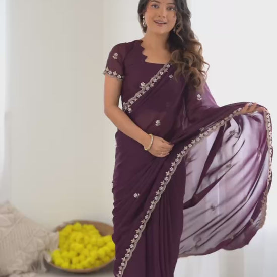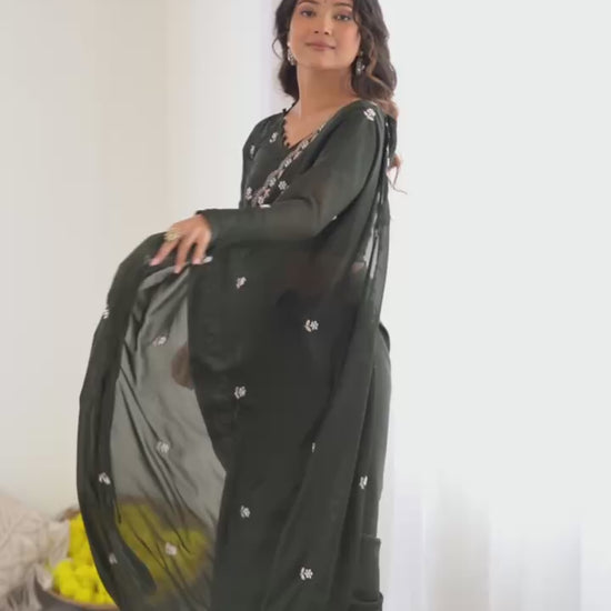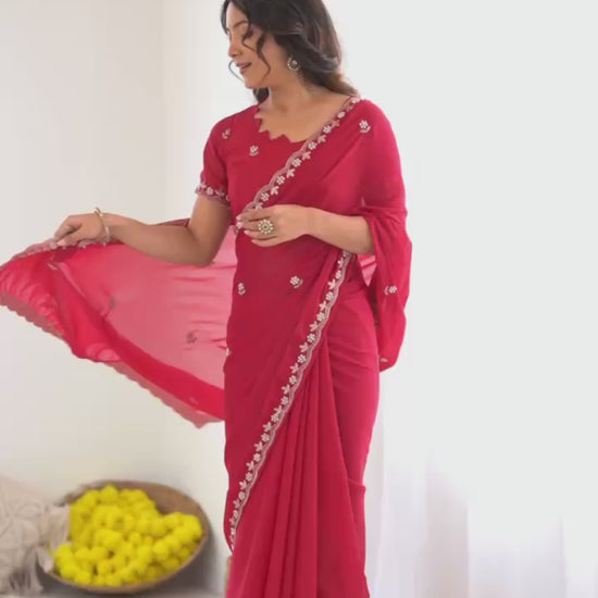 Elevate your ethnic wardrobe with this stunning Heavy Star Georgette Silk Saree, designed to add effortless elegance to every occasion. The saree features intricate embroidery combined with delicate moti (pearl) work, giving it a rich and luxurious look.